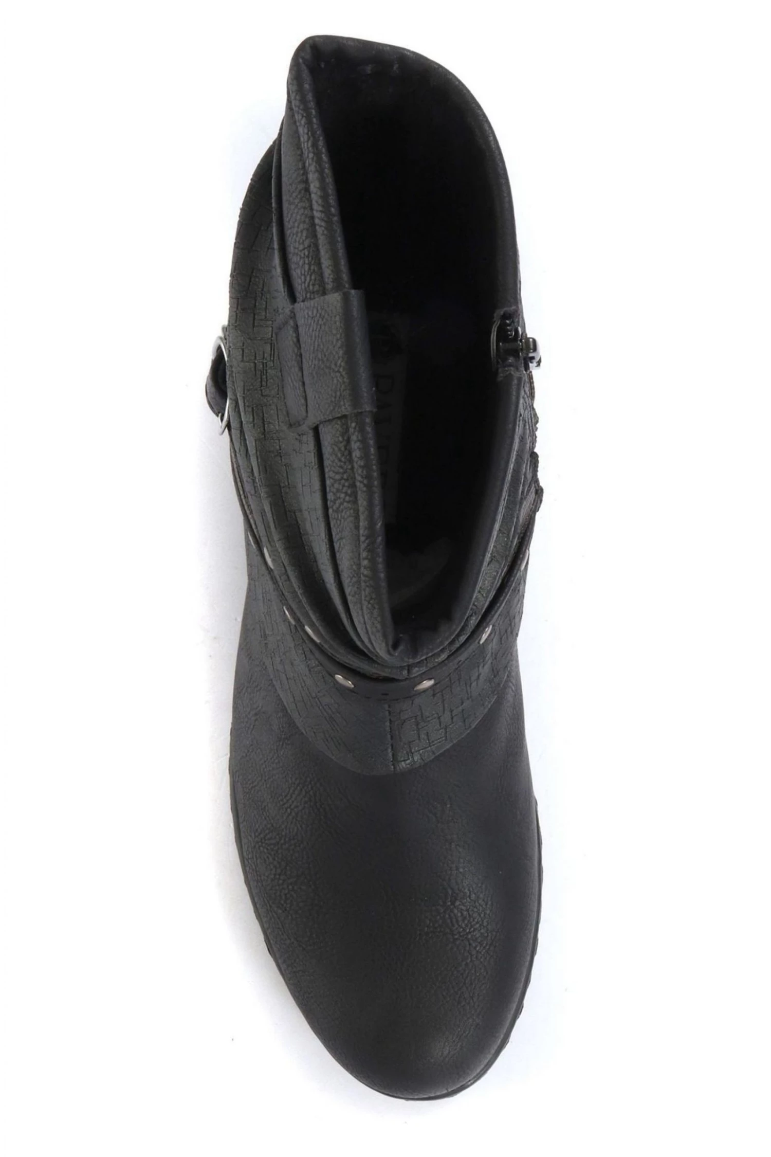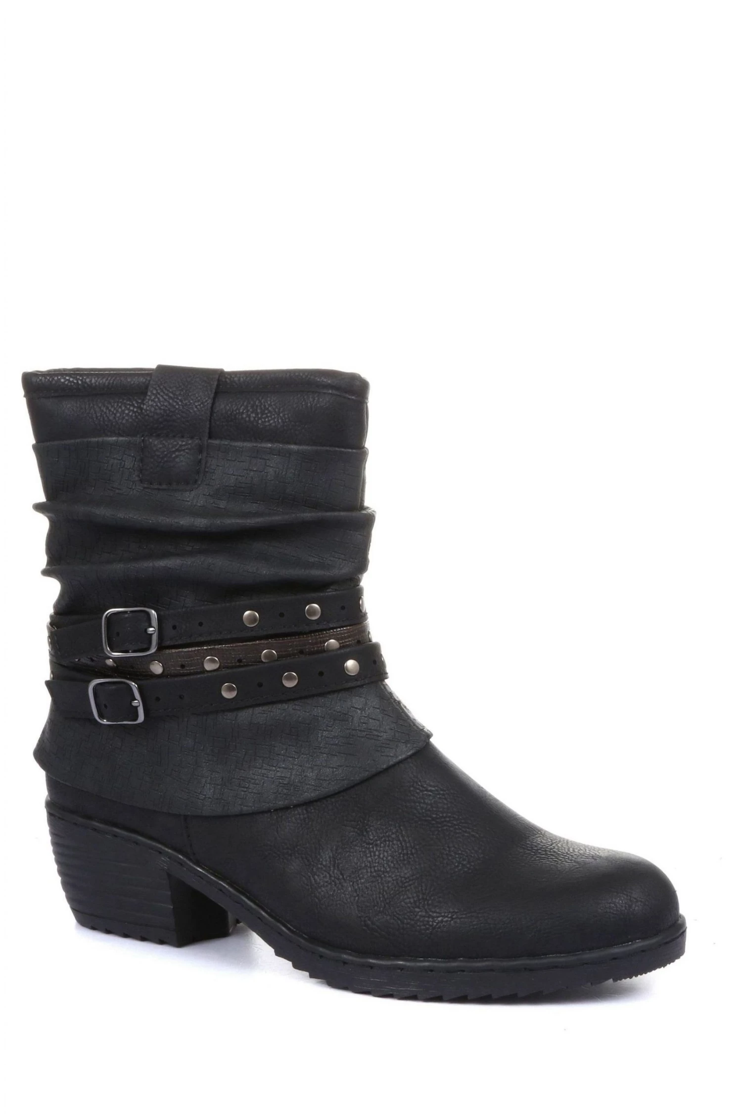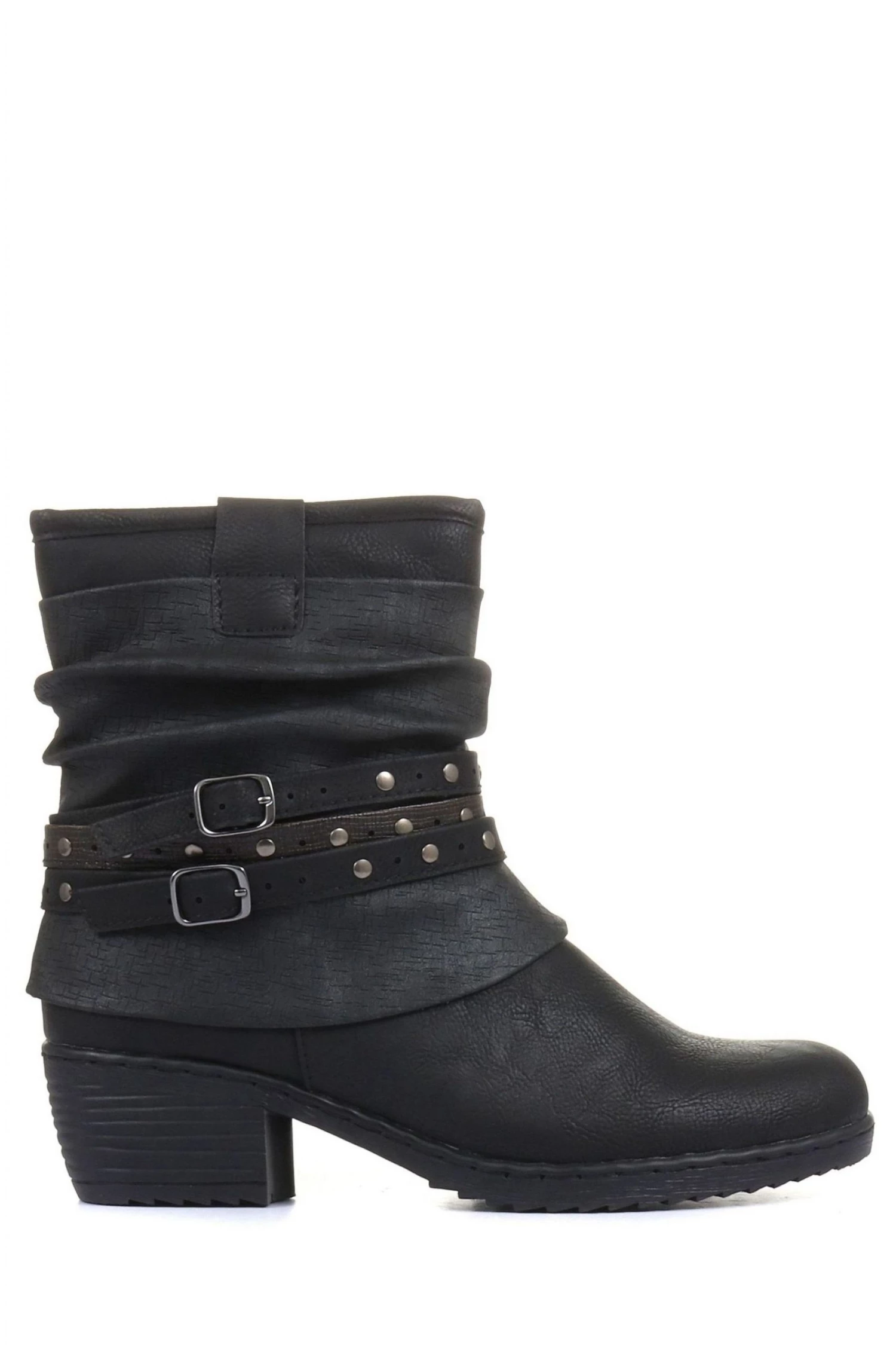 With a creased slouch effect, the boot sits above the ankle. Decorated with buckle ankle straps and lined with soft faux fur a must-have style for the seasons ahead.