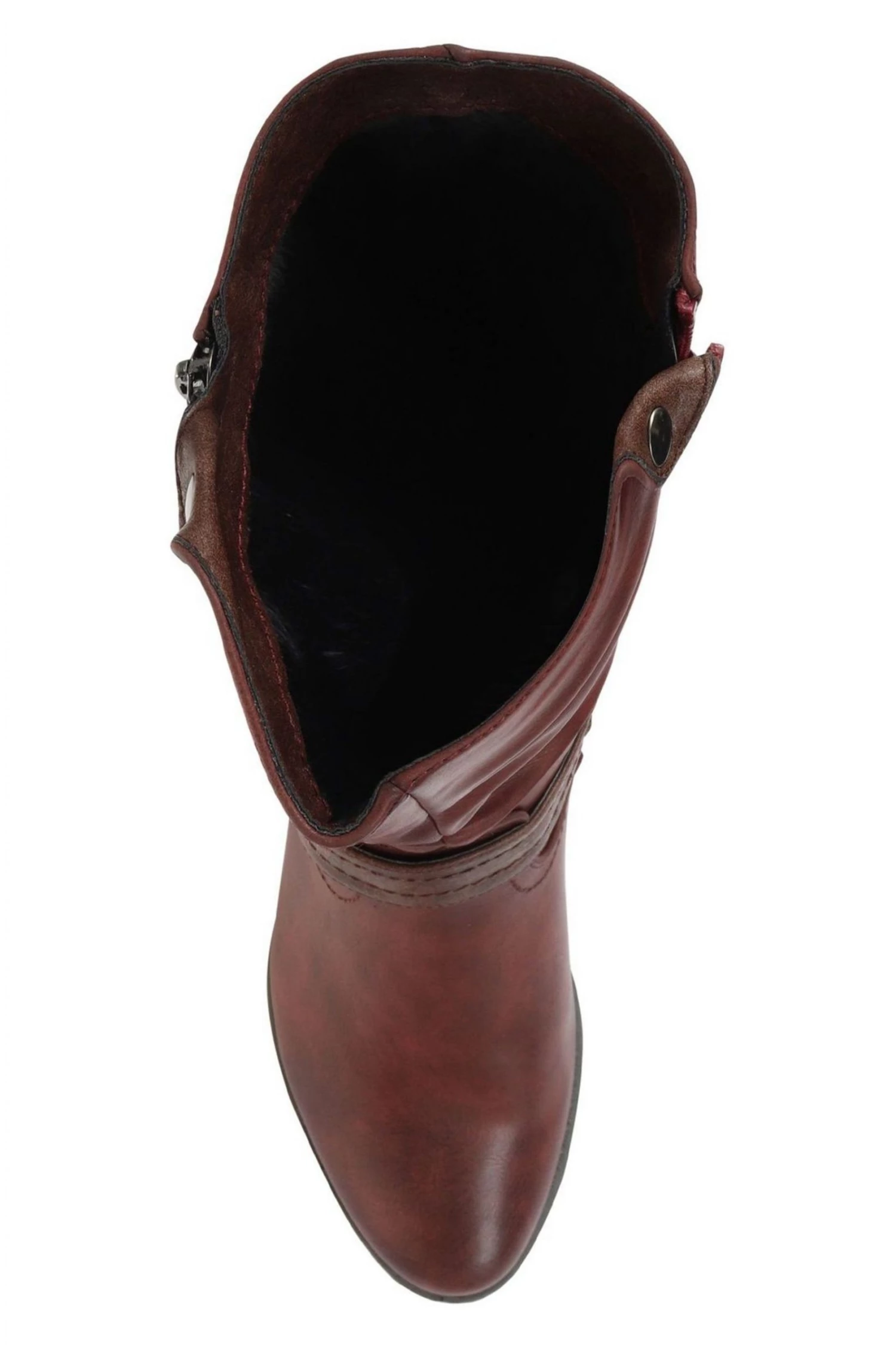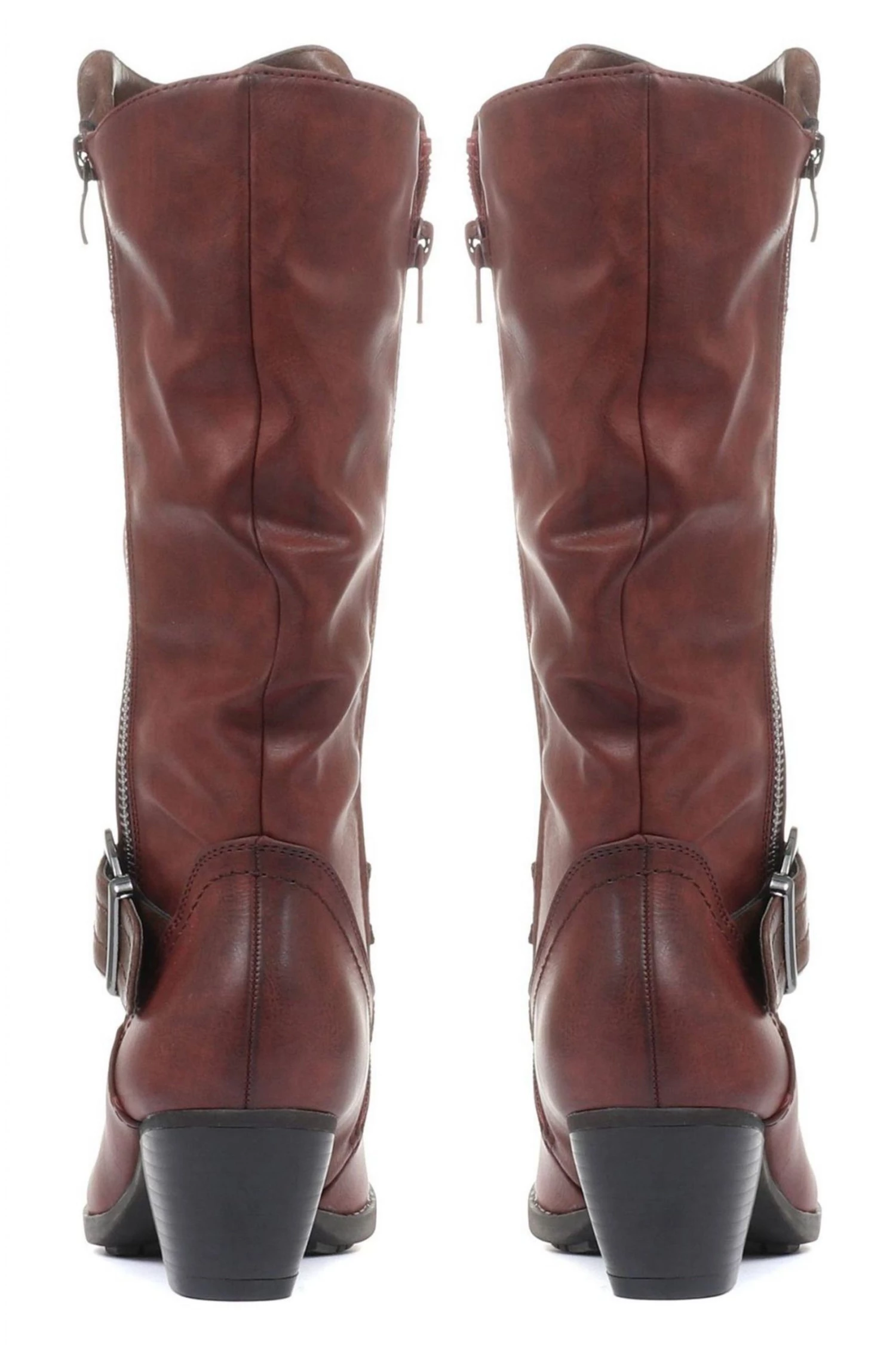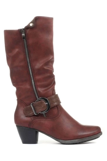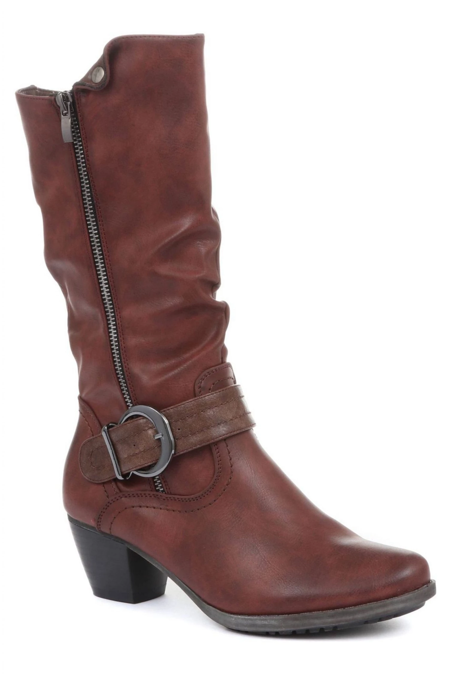 A smart addition to your casual style, the calf boot sits on a short block heel to elevate your everyday wear. Crafted with a mix of synthetic leathers and detailed with an eye-catching buckle strap with decorative faux zip, featuring soft lining for extra snug during chilly days.