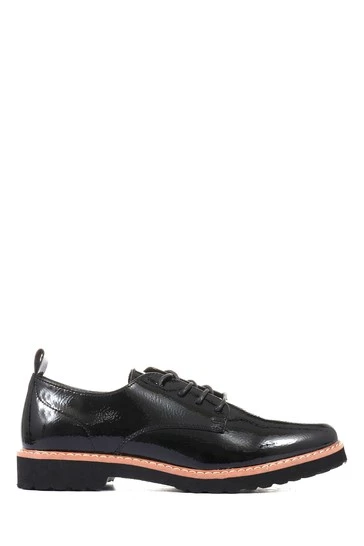Add a touch of cool and comfortable androgyny to your stylings with our ladies’ Derby shoes. A timeless classic that will take you from season to season with ease, our ladies’ lace up shoes are the perfect finishing touch for smart trousers and jeans alike. Imagined in a plain toe Derby silhouette, the women’s shoes are decorated with contrasting topstitching around the welt and are finished with a high shine gloss for a polished look.