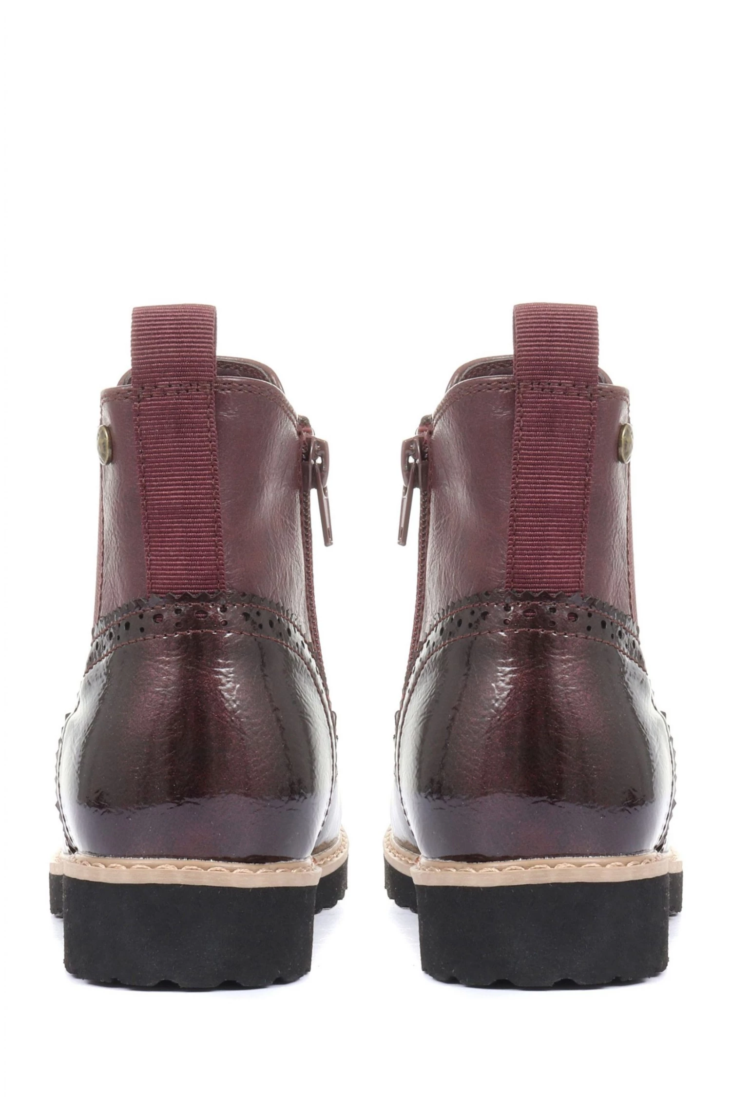 These ladies’ ankle boots are a contemporary take on the classic Chelsea boot. Crafted from a combination of a duo of faux leathers, the boots present a contrast of textures, punctured by classic broguing. Secured with an inside zip for effortless wear, the boots sit upon a contrasting midsole for a modern finish.