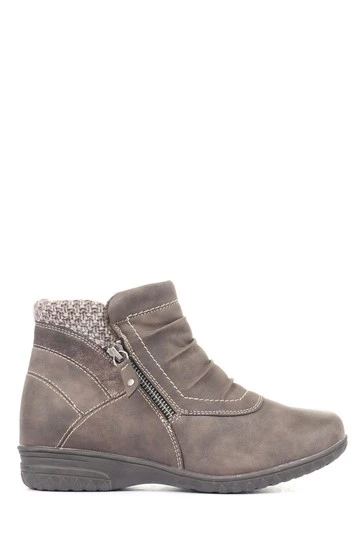 An elegant choice for chilly days, these ladies’ ankle boots are the perfect finishing touch to jeans or skirts and tights alike. Imagined in a low cut ankle boot profile, the boots feature a ruched panel across the vamp for a flattering effect. Secured with an inside zip for easy put on, the boots are topped with a padded textile ankle cuff for a snug finish.