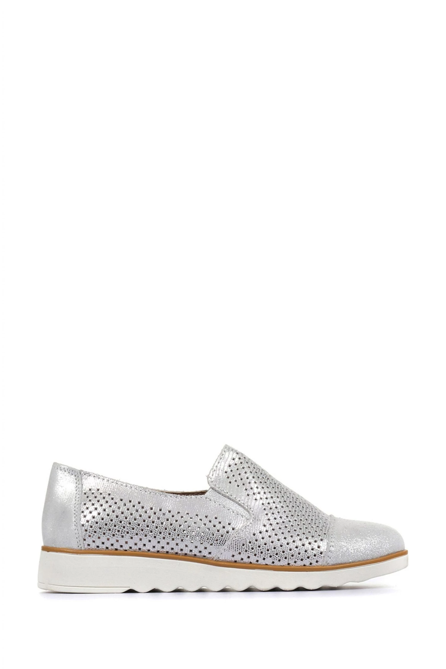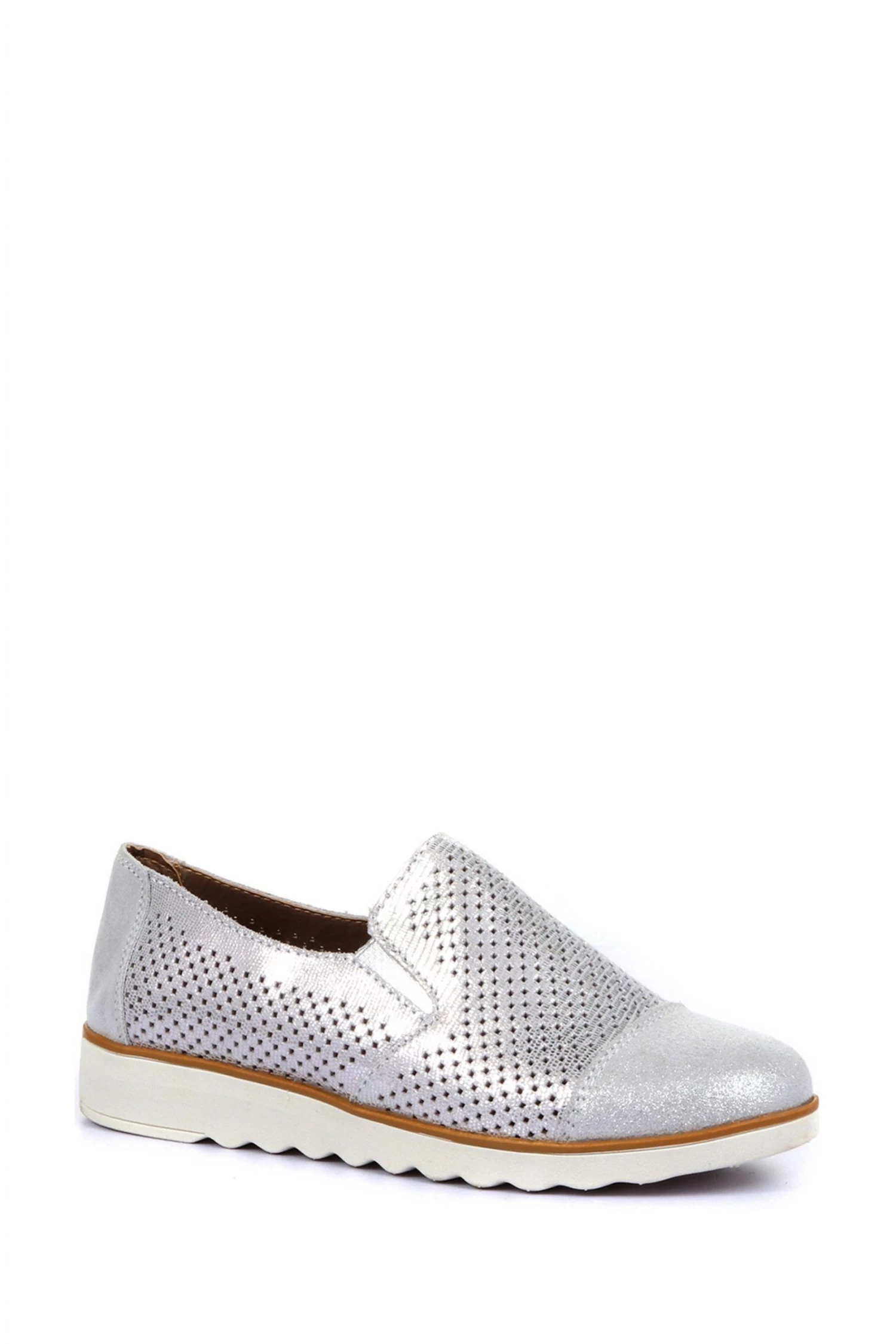 A contemporary twist of a classic slip-on style, metallic leather is decorated with an eye-catching cut-out design. Resting on an extra light contrast sole it adds a shimmering option for your dressed down days, a metallic toe cap completes the revitalising spring style.